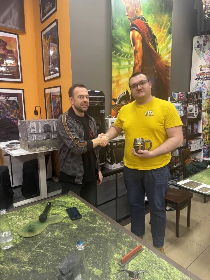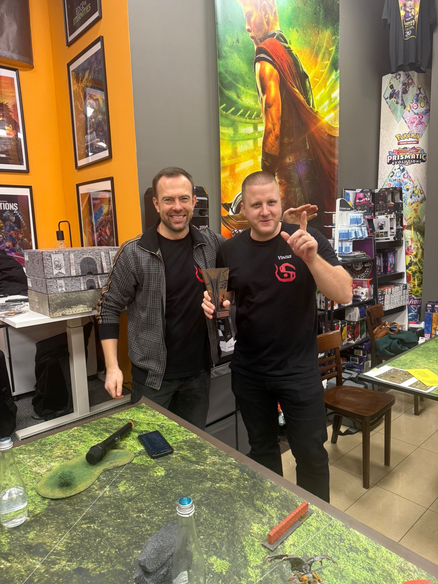 Klimaciarzem turnieju Pyrohammer 2025 został Karol Krajewski! Nawiązując do jego turniejowej koszulki, nawet jeśli “Kostka nie siedzi” tak jak na zdjęciu poniżej, które też pochodzi z wczorajszego turnieju, to liczy się radość z gry i wspólnego spotkania przy stole bitewnym.